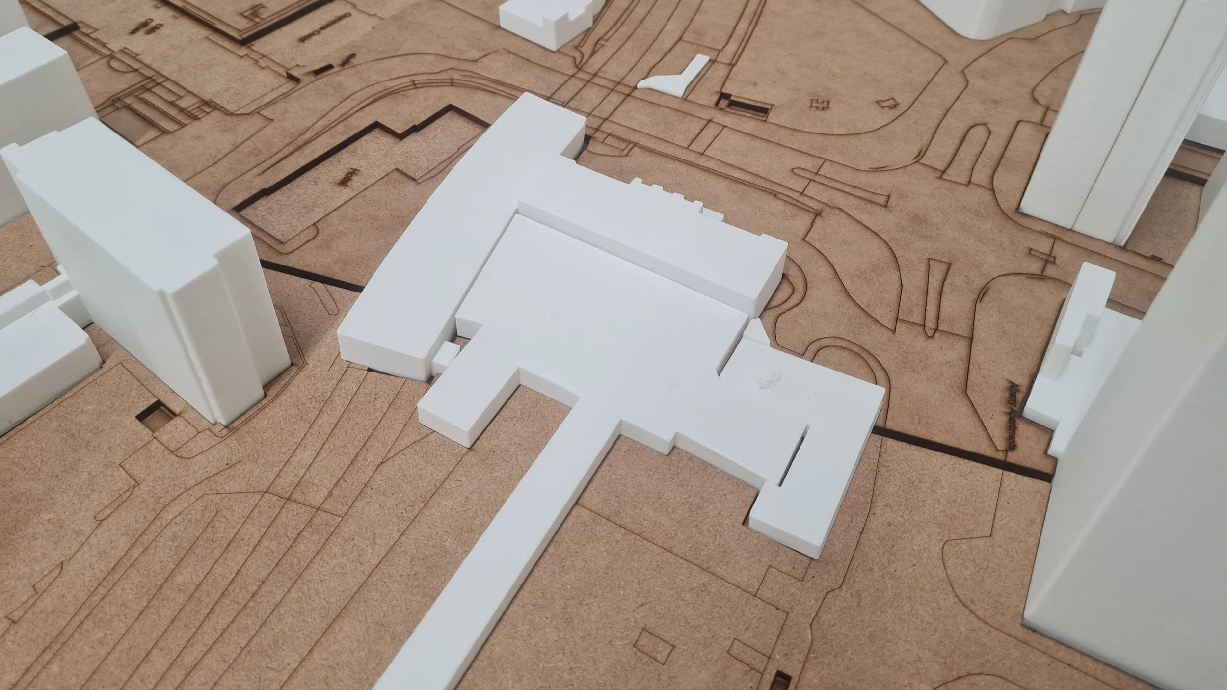 We began the process of creating our model by using data from Digimaps to laser cut a base model, the bottom layer would be etched with site details such as roads and building locations, and the second layer would be cut through to allow a place to hold our 3D buildings within their individual sites.