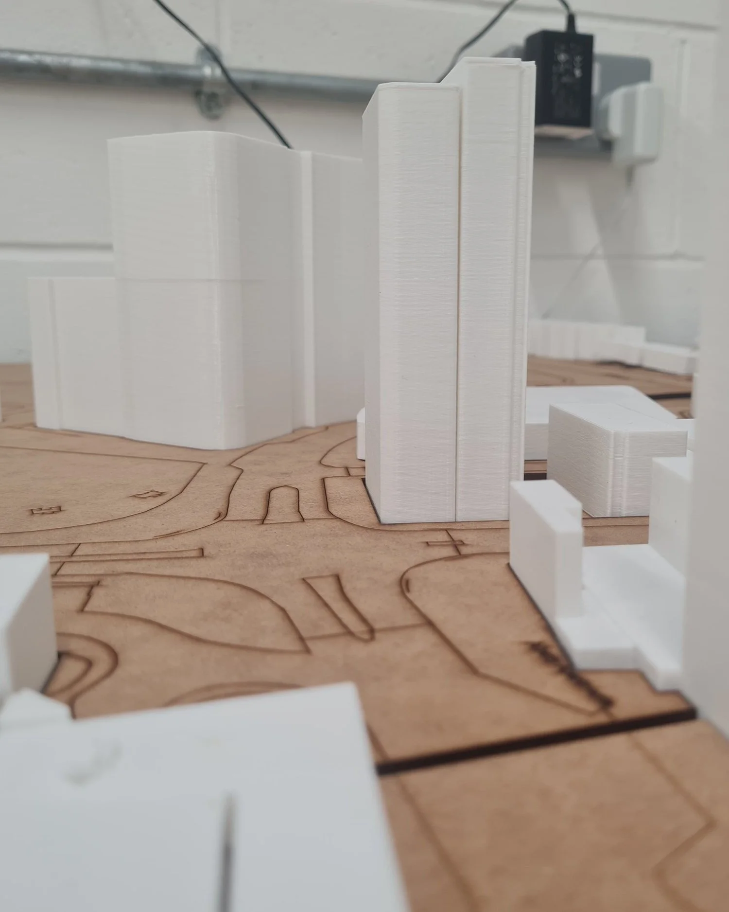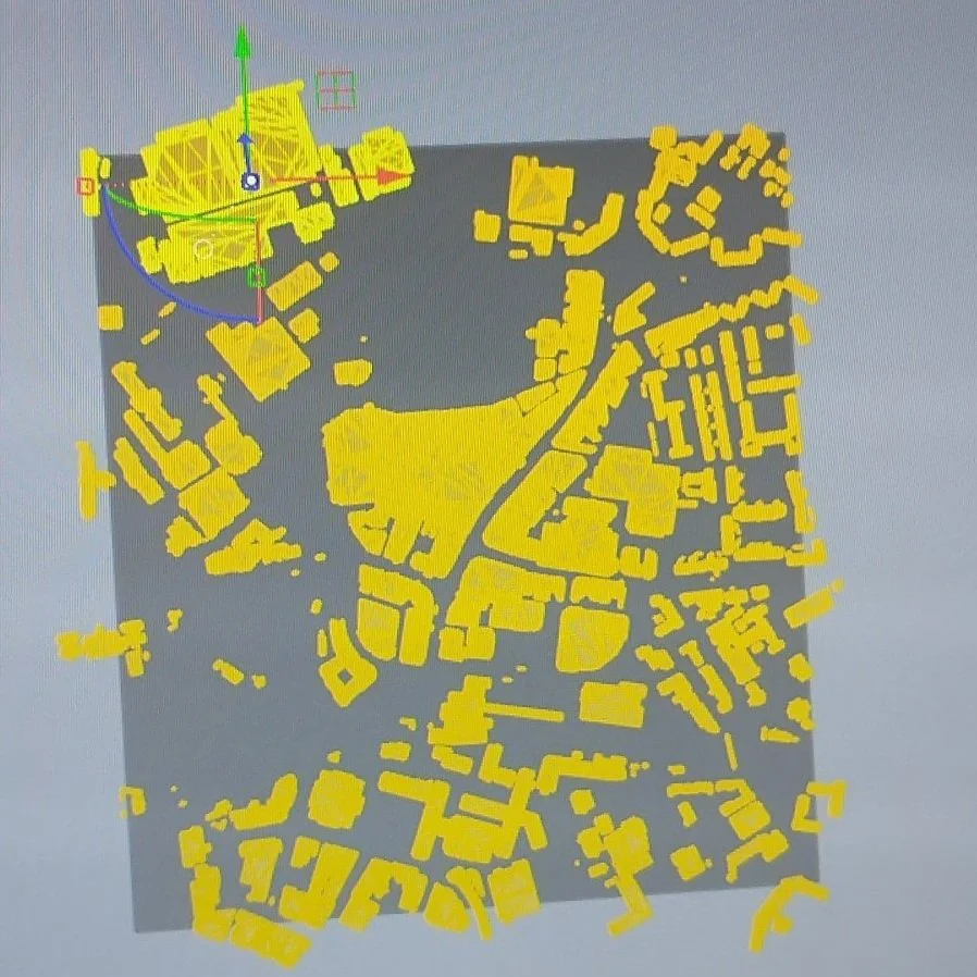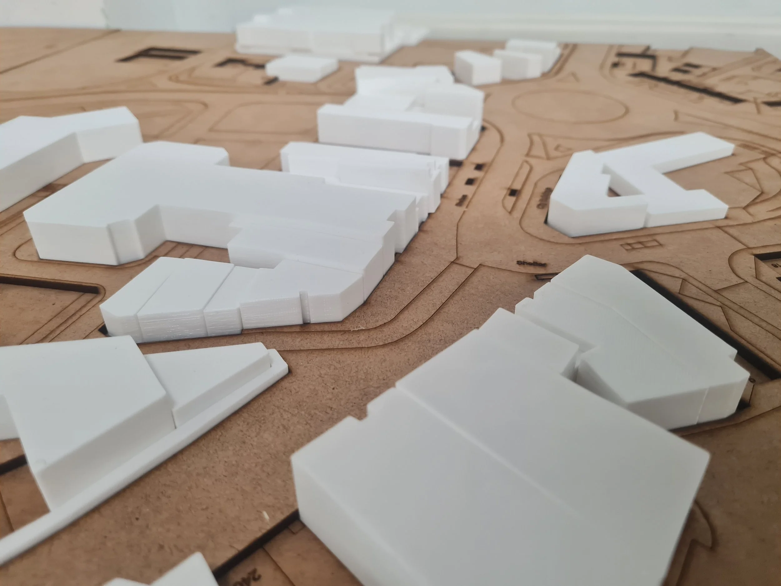 As a studio we decided that 3D printing the individual buildings would be our best option, as it would be easy to mass create models, but it was both cheaper than CNC milling machine, but also created more sturdy models which could be used to create much smaller details.